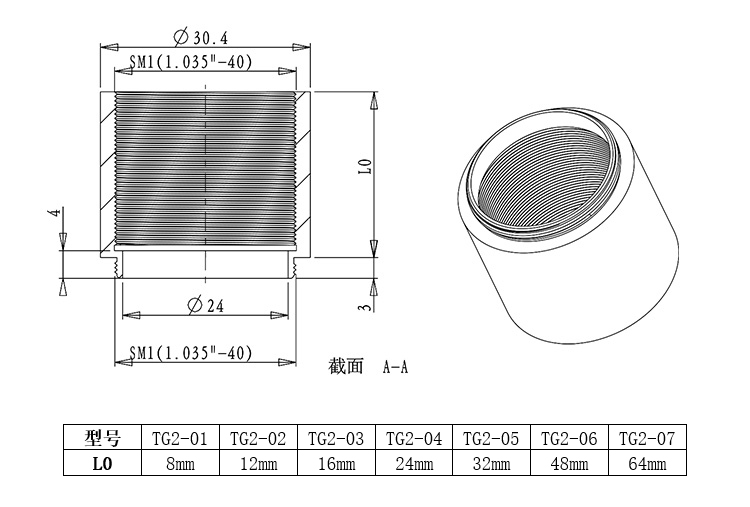TG2-02 | φ30.5mm,管身高度12mm | SM1(1.035"-40)内外螺纹 | 6.9g |