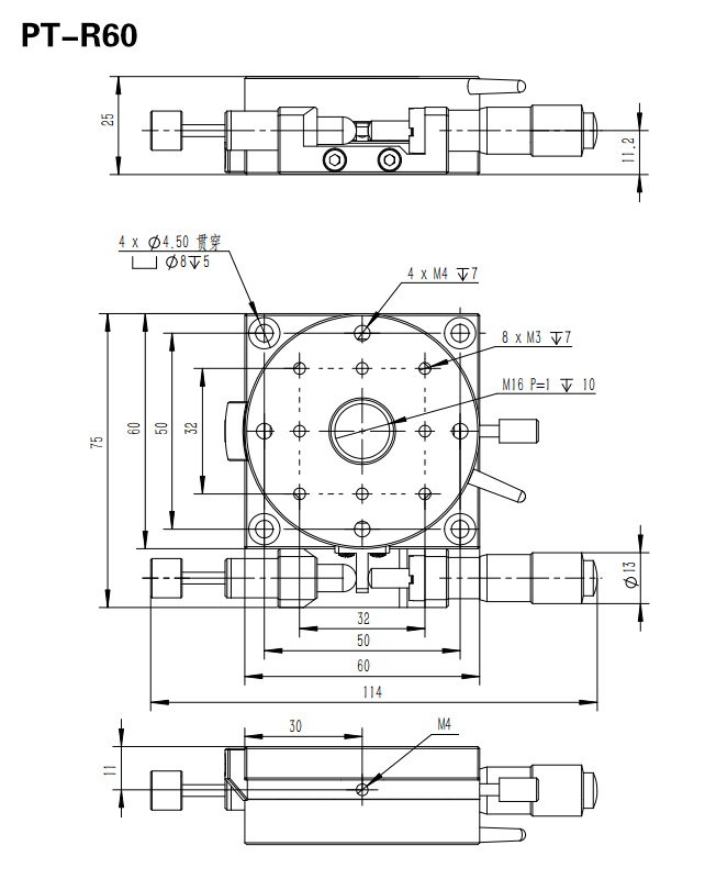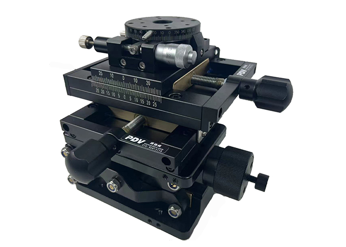 这款手动四维组合台由1个手动升降台PT-SD408,2个手动平移台PT-SD102P(50mm),1个手动旋转台R60组合而成。