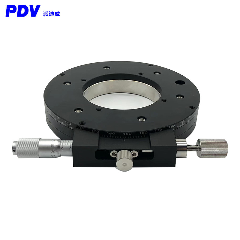 此系列手动旋转平台为中空型粗微调精密旋转平台,该平台可进行粗调360°旋转和微调±5°,粗调时松开切换螺丝,直接调整平台上平面,微调时锁紧切换螺丝,操作极为方便。平台本体采用高强度铝合金,经喷砂黑色阳极氧化,配以十字交叉滚柱轴承,可以实现高精度和高钢性。